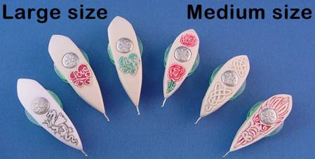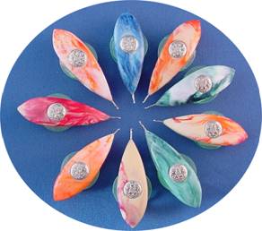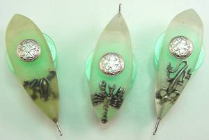 Small trinkets can be placed in the mold to capture the design in one end or the other of the shuttle. These types of shuttles are limited to availability of "trinkets" that can fit within the shuttle's body. The embedded single shuttles are $ 40.00 each.